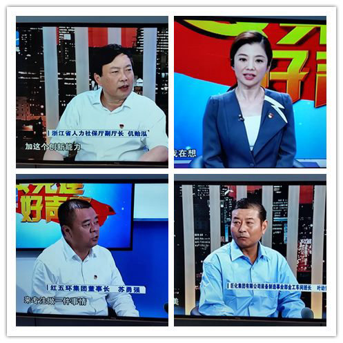 紅五環集團董事長、黨委書記蘇勇強受邀參加電視訪談。參加訪談嘉賓還有浙江省人力社保廳副廳長仉貽泓、巨化集團有限公司裝備制造事業部金工車間班長葉幼青。