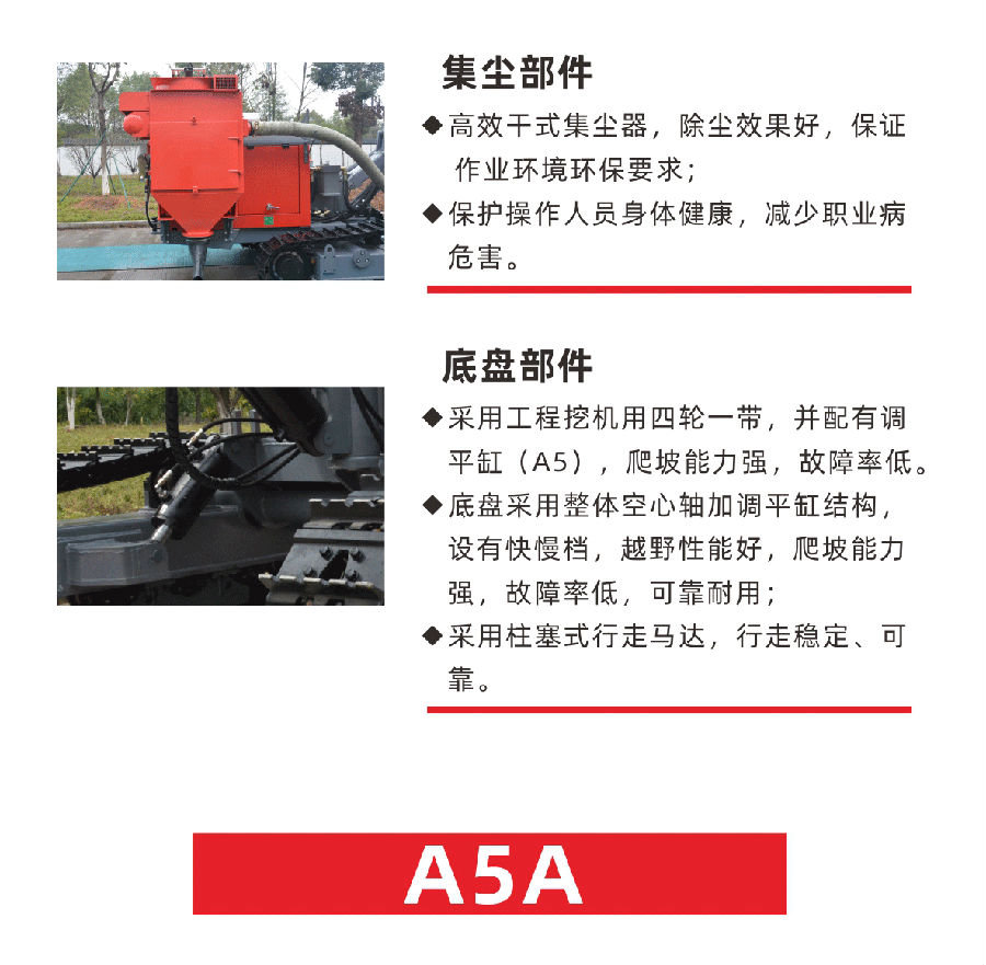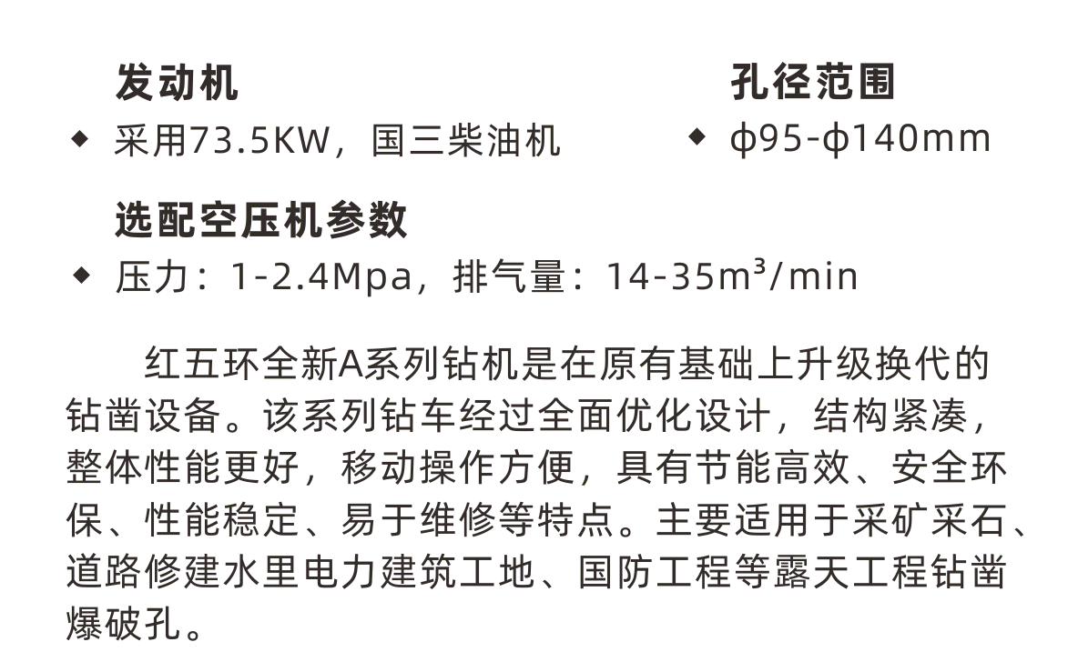 紅五環(huán)全新A系列鉆機是在原有基礎上升級換代的鉆鑿設備。該系列鉆車經過全面優(yōu)化設計,結構緊湊,整體性能更好,移動操作方便,具有節(jié)能高效、安全環(huán)保、性能穩(wěn)定、易于維修等特點。主要適用于采礦采石、道路修建水里電力建筑工地、國防工程等露天工程鉆鑿爆破孔。