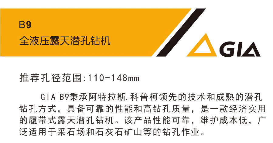 推薦孔徑范圍:110-148mmGIA B9秉承阿特拉斯.科普柯領先的技術和成熟的潛孔鉆孔方式,具備可靠的性能和高鉆孔質量,是一款經濟實用的履帶式露天潛孔鉆機。該產品性能可靠,維護成本低,廣泛適用于采石場和石灰石礦山等的鉆孔作業。
